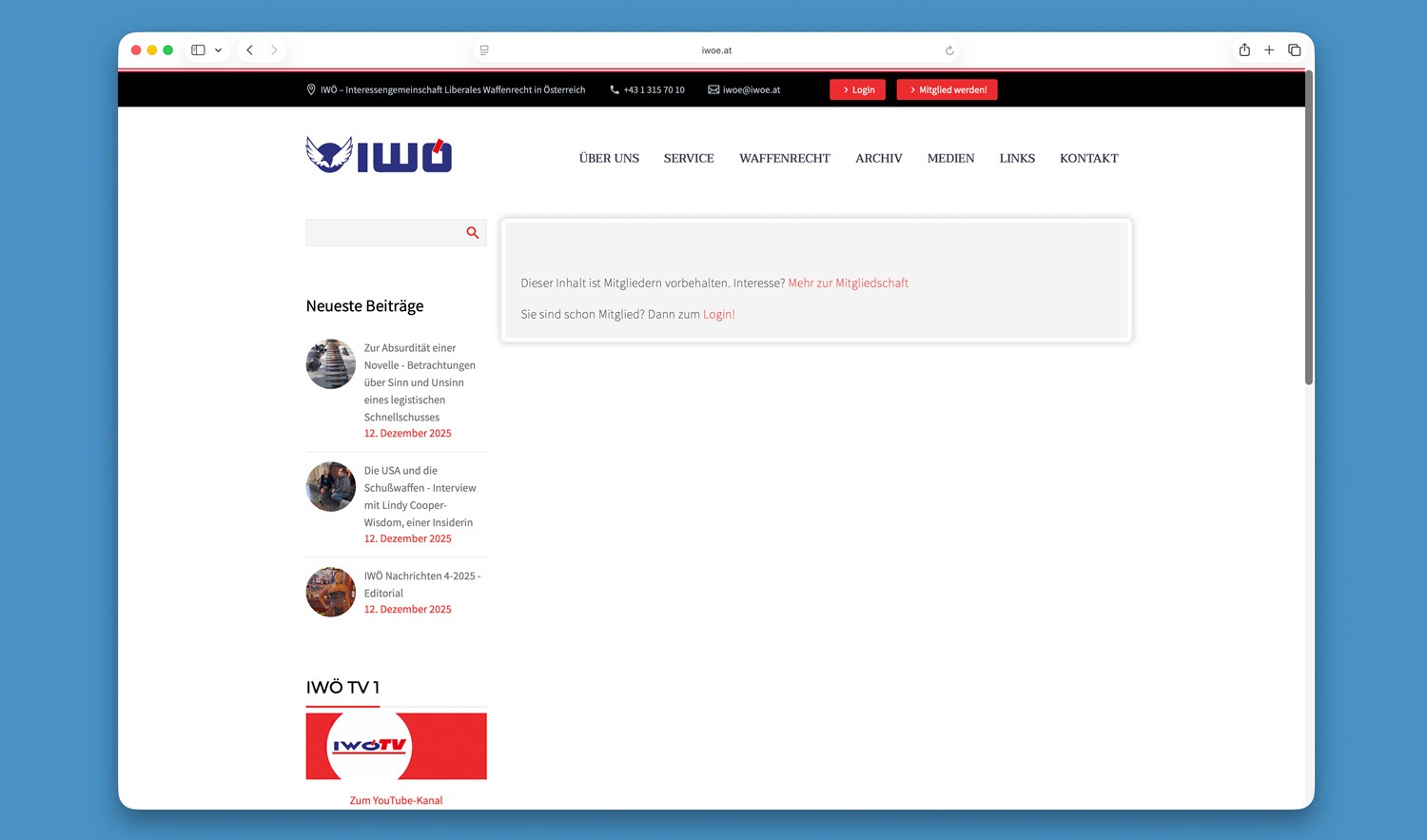 Die IWÖ-Webseite war jahrzehntelang frei für alle zugänglich, die sich rund um aktuelle Entwicklungen sowie Historisches zum österreichischen Waffenrecht und damit zusammenhängende Entwicklungen informieren wollten. Um der IWÖ-Mitgliedschaft eine neue Qualität zu verleihen, haben wir uns jetzt entschlossen, wesentliche Bereiche und Informationen auf unserer Webseite nur noch exklusiv unseren IWÖ-Mitgliedern zugänglich zu machen. Wir folgen damit auch einem aktuellen Trend, Informationen, deren Zusammenstellung mit viel Arbeit verbunden ist, nicht mehr kostenlos allgemein zugänglich zu machen.